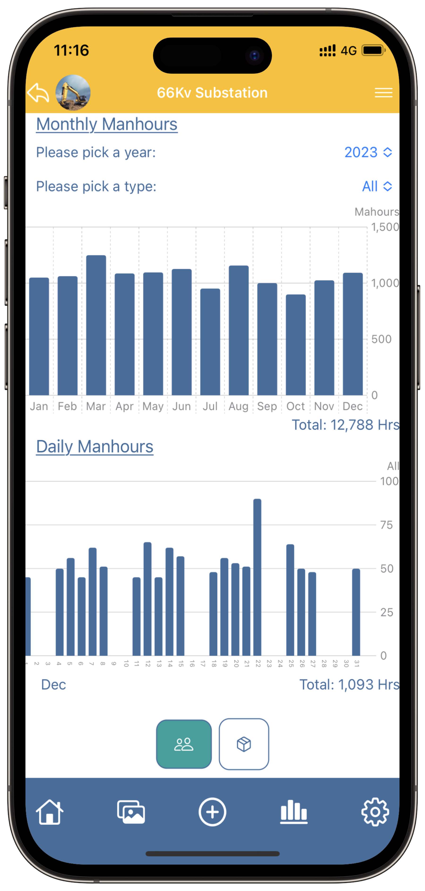 Track progress with visual charts for manhours, materials usage, and project timeline.